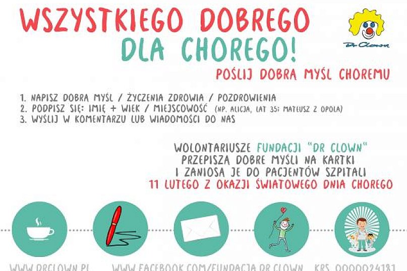 Z okazji Światowego Dnia Chorego, który przypada jutro 11 lutego, Fundacja "Dr Clown" zaprasza do udziału w akcji Wszystkiego dobrego dla chorego!, która ma przekazać chorym wsparcie, nadzieję i dobrą energię. W ramach akcji "Wszystkiego dobrego dla chorego!" każdy, kto zechce, może napisać chorej osobie list z wyrazami życzliwości i wparcia. Wolontariusze Fundacji 11 lutego, w Światowy Dzień Chorego, i w następnych dniach, przekażą listy pacjentom szpitali w Łodzi i Kutnie, a dodatkowo również w innych miejscach Polski. Do akcji włączyli się uczniowie szkół z Łodzi, Kutna i Lipin. – Chorzy zasługują zawsze na szczególną uwagę i nasi wolontariusze właśnie im zawsze poświęcają dużo czasu i obdarowują ich swoją energią. Z okazji Światowego Dnia Chorego możemy przypomnieć o chorych innym, skłonić do refleksji, a dobre myśli na pewno dadzą pacjentom dużo siły do walki z chorobą – komentuje Katarzyna Szczęsna, Pełnomocnik Fundacji „Dr Clown” w Łodzi. Kartki trafią do pacjentów Centralnego Szpitala Klinicznego Uniwersytetu Medycznego w Łodzi Ośrodek Pediatryczny im Marii Konopnickiej przy ul. Spornej oraz do Kutnowskiego Szpitala Samorządowego. Życzenia można przekazać wirtualnie, za pośrednictwem Facebooka – tak przekazane listy zostaną przepisane przez wolontariuszy Fundacji „Dr Clown” i również przekazane chorym. Wirtualne życzenia można przesyłać w formie wiadomości lub komentarza w wydarzeniu na fanpejdżu łódzkiego oddziału Fundacji „Dr Clown” na Facebooku (https://www.facebook.com/events/1768960280097828/). „Wirtualnie” przekazane kartki zostaną przepisane przez wolontariuszy i również przekazane chorym. W przekazywanie dobrej energii chorym zaangażowali się uczniowie szkół – Zespołu Szkół Zawodowych Specjalnych nr 2 w Łodzi, Zespołu Szkół Ekonomiczno - Turystyczno - Hotelarskich im. Władysława Grabskiego w Łodzi, Szkoły Podstawowej nr 173, mieszkańcy DPS "Jantar" w Lipinach, Szkoły Podstawowej nr 1 w Kutnie, Liceum Ogólnokształcącego nr I im. Gen. J.H. Dąbrowskiego w Kutnie
