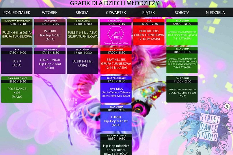 Street Dance Studio opracowało szereg zajęć taneczno-fitnessowych, tanecznych, POLE DANCE i fitness dla każdego. Sprawdź nasza ofertę i dołącz do grona naszych kursantów. Mamy najobszerniejsza ofertę zajęć fitness w Kutnie. Zajęcia odbywają się w STREET DANCE STUDIO na ul.1 Maja 16 w Kutnie.