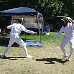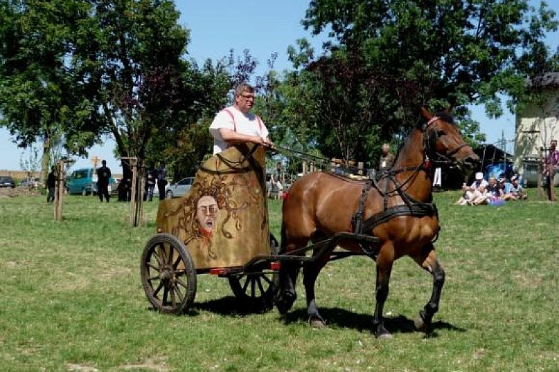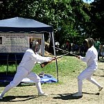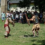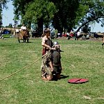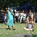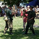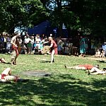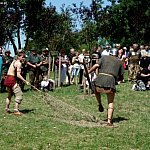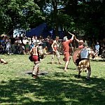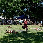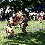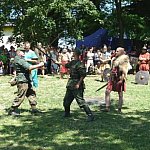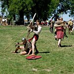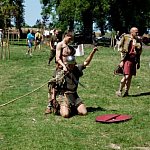 Niedzielna odsłona IV Zlotu Grup Rekonstrukcji Historycznych ODYSEJA HISTORYCZNA w Leszczynku z mocnymi akcentami starożytnymi i nowożytnymi trwała jak zawsze co roku krócej niż zlotowa sobota. Krócej jednak to nie znaczy mniej bogato, co prawda nie odbyły się niektóre planowane pokazy jednak inscenizacja „Powstania Spartakusa” oraz kolejna po wczorajszych z II wojny światowej pt. „Niemcy 1945” wynagrodziła widzom ominięte punkty programu. Jedna z grup rekonstrukcyjnych przypomniała walki gladiatorów. Prowadzący pokaz polemizował z obrazem rozpowszechnianym przez współczesną kinematografię - jego zdaniem kciuk w górę oznaczał śmierć, gdyż symbolizował podniesienie miecza, kciuk w dół oznaczał ułaskawienie (opuszcznie miecza). Filmowy obraz gladiatorów jako wysportowanych szczupłych mężczyzn również jest nieprawdziwy. Gladiator musiał mieć nadwagę, aby ostrze miecza wyhamowywało impet na tkance tłuszczowej, nie sięgając zbyt łatwo ważnych organów wewnętrznych. Widowisko nie mogło przecież skończyć się zbyt szybko. Czterech chętnych z grupy rekonstruktorów niemieckich jednostek z drugiej wojny światowej wzięło udział w lekcji walki na miecze. Gladiatorzy odegrali również scenę buntu, napadając na cesarza, co miało przypomnieć publiczności powstanie Spartakusa.
