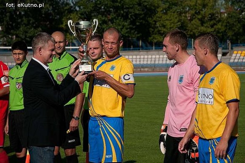 Wczoraj w meczu trzeciej kolejki III ligi MKS Kutno rozgromił Widzew II Łódź aż 5:1. Podopieczni Pawła Ślęzaka zagrali bardzo dobrze i wynik w pełni odzwierciedla różnicę między obiema drużynami. Podczas prezentacji drużyn wiceprezes ŁZPN Adam Kaźmierczak wręczył na ręce Łukasza Znyka, który w tym meczu pełnił funkcję kapitana zespołu, puchar Fair Play dla drużyny MKS-u za ubiegły sezon. Jedynie na początku spotkania Widzew wydawał się równorzędnym przeciwnikiem dla kutnian. Piłkarze gości przeprowadzili kilka udanych akcji, ale bramce strzeżonej przez Sokołowicza nie zagrozili. MKS z kolei starał się długo utrzymywać przy piłce i czekał na dogodną okazję. Ta nadarzyła się już w 10 minucie. Piotr Michalski uderzył płasko z 18 metrów i piłka wpadła do siatki tuż przy prawym słupku. Jednak gol ten, w równym stopniu co Michalski, na swoje konto może zaliczyć bramkarz gości. Wlazłowski, prawdopodobnie oślepiony słońcem, źle ocenił lot piłki i pozwolił jej wtoczyć się do bramki, choć wydawało się, że powinien ją z łatwością wybić. Po zdobyciu bramki „Miejscy” całkowicie zdominowali młodych widzewiaków. Łódzcy obrońcy i pomocnicy szybko tracili piłkę, co pozwalało naszym zawodnikom stwarzać dogodne sytuacje. Groźnie strzelali Płacheta i ponownie Michalski, ale albo pudłowali, albo bramkarz gości stał już na posterunku. Po 20 minutach goście ocknęli się i stworzyli dwie bardzo dogodne sytuacje, lecz w obu przypadkach strzelali wprost w ręce Sokołowicza. Z kolei Kutnianie mogli potwierdzić swoją przewagę drugim golem, ale po doskonałym rajdzie Płachety wzdłuż linii końcowej zabrakło dokładnego podania w pole karne i goście wybili piłkę na rzut rożny. Druga połowa, podobnie jak pierwsza, rozpoczęła się od kilku groźnych kontr gości. Później jednak zobaczyliśmy koncert gry MKS. W 54. minucie Gorczyczewski uciekł obrońcom i z prawej strony idealnie zagrał do nadbiegającego Mitury, który z pięciu metrów, mimo asysty obrońcy, wpakował piłkę do bramki. Kilka minut później zmęczonego Gorczyczewskiego, który w tym meczu solidnie się napracował, zmienił Jarosław Szyc. W 66. minucie piłka po raz trzeci zatrzepotała w widzewskiej bramce, ale Łukasz Znyk, który ją tam skierował, był na wyraźnym spalonym.