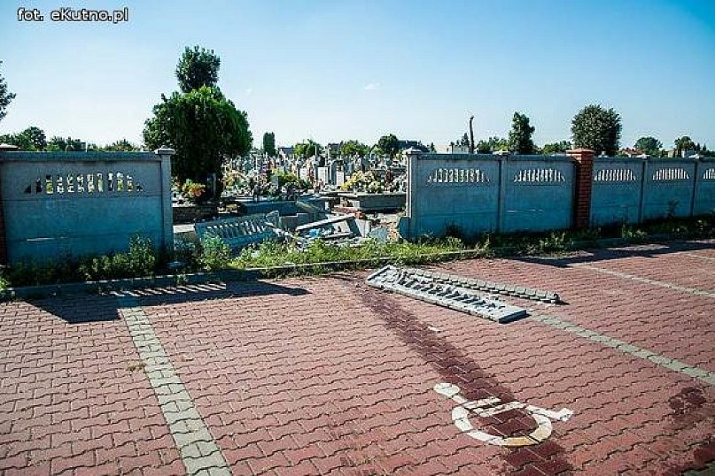 Dziś rano mieszkańcy Kutna, którzy wybrali się na cmentarz na Łąkoszynie ujrzeli zniszczone groby i rozwalone przęsło ogrodzenia cmentarza. Na miejscu interweniowała już policja. - Wieczorami i w nocy odbywają się na cmentarnym parkingu wyścigi, kierowcy ćwiczą swoje umiejętności, "kręcą bączki", palą gumę - opowiada mieszkanka Kutna. - Czasem jest bardzo głośno i niebezpiecznie. Pewnie jeden z nich tej nocy wpadł na to ogrodzenie. - Słyszeliśmy jakiś huk, ale pomyśleliśmy, że to gdzieś dalej wypadek był - dodaje sąsiad z Łąkoszyna. -Widać, że chyba miskę olejową sobie kierowca rozwalił, bo ślady oleju ciągną się przez cały parking - mówi młody mężczyzna. Kierowca przyznał się już do winy i zapłaci odszkodowanie rodzinie zmarłego, którego grób został zniszczony. Po złożonych przez mężczyznę wyjaśnieniach, policja uznała staranowanie ogrodzenia cmentarza za nieszczęśliwy wypadek, ponieważ kiedy wczoraj wieczorem mężczyzna naprawiał samochód na parkingu przy cmentarzu w pewnym momencie, włączył się mu bieg i samochód wjechał w mur.