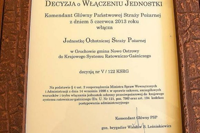 Dziś w Grochowie w gminie Nowe Ostrowy odbył się uroczysty apel z okazji włączenia jednostki OSP Grochów do Krajowego Systemu Ratowniczo-Gaśniczego. Decyzja Komendanta Głównego Państwowej Straży Pożarnej zapadła 5 czerwca br. a wdzisiejsze piątkowe popołudnie ochotnicy z Grochowa ją odebrali i uczcili. Na uroczystości pojawili się miedzy innymi członek Zarządu Powiatu Kutnowskiego Mirosław Ruciński, Wójt gminy Nowe Ostrowy Zdzisław Kostrzewa, Zastępca Komendanta Wojewódzkiego Państwowej Straży Pożarnej w Łodzi brygadier Mariusz Konieczny, Naczelnik Wydziału operacyjnego Komendy Wojewódzkiej PSP w Łodzi brygadier Zbigniew Łyszkowicz, Komendant Powiatowy Państwowej Straży Pożarnej w Kutnie brygadier Marek Myszkowski wraz z współpracownikami. - Miejscowy proboszcz parafii założył OSP Grochów wiosną 1917 roku przy zaangażowaniu gospodarzy i właściciela majątku Romualda Różyckiego, który został pierwszym prezesm OSP. Do straży zapisało się wówczas 30 ochotników. Potem założono kółko dramatyczne, orkiestrę dętę i w 1927 r. wybudowano pierwszą remizę. W tym też roku OSP Grochów otrzymała dwucylindrową sikawkę ręcznę i 100 m węża, z własnych środków zakupiono hełmy, umundurowanie i beczki. W okresie okupacji hitlerowskiej zamarła działalność społeczna. Wielu strażaków wywieziono na przymusowe roboty do III Rzeszy. Już w 1945 roku powołano powojenny zarząd OSP z Feliksem Cichockim na czele. Na przestrzeni lat jednostka wymieniała sprzęt na nowocześniejszy, a ochotnicy podnosili swoje kwalifikacje - rys historyczny OSP Grochów przedstawił druh Ryszard Obijalski. Wszyscy przybyli goście złożyli życzenia strażakom ochotnikom, doceniając ich pracę i odwagę dla dobra ogółu. I my również życzymy wszystkiego najlepszego i gratulujemy włączenia jednostki do KSRG.