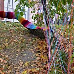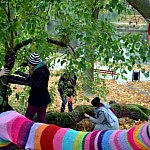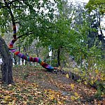 ZOBACZ, DOTKNIJ, USŁYSZ. Te trzy hasła zapowiadały dwudniowe seminarium poświęcone działaniom artystycznym w przestrzeni publicznej, które odbyło się w dniach 24-25 października w Muzeum Regionalnym w Kutnie. Spotkania te były rozwinięciem projektu Pejzaż Rudymentarny, tym razem zamiast prezentacji w kraju prac o Kutnie, nasze miasto gościło osoby działające z przestrzeniami publicznymi w innych miejscach świata. Kielecka artystka Joanna Biskup-Brykczyńska, na zaproszenie organizatora przygotowała realizację plenerową w duchu tzw. „włóczkowej partyzantki”, zaprezentowała również monumentalną grafikę oraz dokumentację swoich działań kolorem, humorem i zaskoczeniem, które wyrywają mieszkańców, użytkowników miast z codziennej rutyny. Ciekawym wątkiem okazała się historia społecznej obrony drzewostanu na jednym z kieleckich osiedli, kiedy to działanie z kolorowymi włóczkami pozostawiło efekt nie tylko w postaci uratowanych od wycinki drzew, ale również w uformowaniu sąsiedzkiej społeczności. Dotychczas o takich akcjach mieszkańcy Kutna mogli czytać w Internecie lub niszowych czasopismach, od soboty mamy nad stawem w Parku im. R.Traugutta własne, niezwykłe drzewo. Przez minione dni przybywa nam zdjęć uśmiechniętych mieszkańców pozujących na kolorowym i ciepłym w dotyku pniu. Osobiście bardzo cieszy mnie ta realizacja, wybrane do niej drzewo od lat pobudza moją wyobraźnię, jego kształt, w domyśle historia i możliwa symbolika zasługują na uwiecznienie. Uczestnictwo w montażu gigantycznego „szala” i tkaniu barwnych promieni, było nie tylko lekcją włóczkowych technik, ale też zachętą do kontynuacji, do dbałości o ten poskręcany pień i do grupowych prób nadawaniu mu znaczeń.