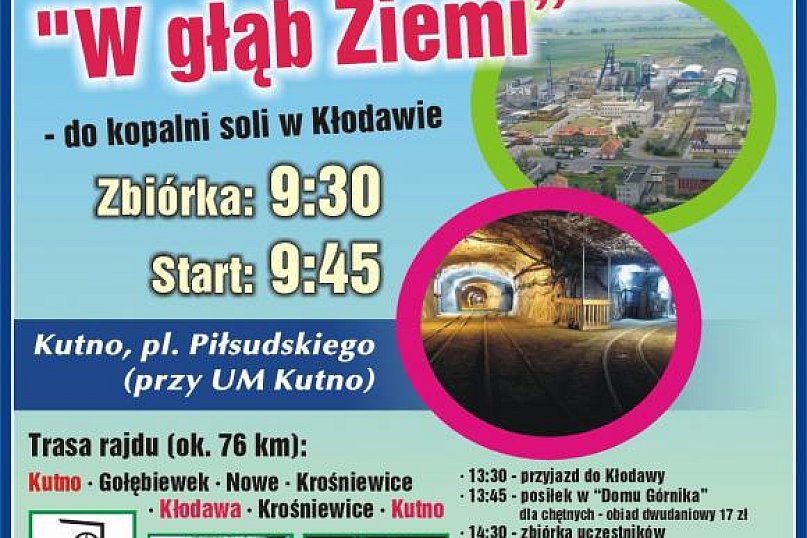 Mocnym akcentem zaczynamy naszą, tegoroczną przygodę z rowerem – rajdem „W głąb Ziemi” do Kopalni Soli w Kłodawie. Było to dla nas duże wyzwanie zarówno pod względem organizacyjnym jak i logistycznym. Lecz dzięki pomocy zaprzyjaźnionych z nami klubów: Solni Cykliści z Kłodawy (Włodzimierz Kowalczyk) oraz Zamkowi Cykliści z Przedcza (Rafał Faryński) udało się w 100%. „Lista obecności”, kilka słów przypomnienia o zasadach bezpieczeństwa i możemy ruszać. Przed nami około 38 km trasy (Gołębiewek, Skłóty, Nowe Kutnowskie, Krośniewice, Głaznów, Chodów, Kłodawa), którą mieliśmy pokonać jadąc spokojnie wesołą grupą. Nikt z uczestników nie przypuszczał, że będzie to ogromne wyzwanie. Naszym największym wrogiem w tym dniu nie była odległość czy ukształtowanie terenu, lecza WIATR. Jego siłę poczuliśmy po raz pierwszy na odcinku Skóty – Nowe Kutnowskie. Przerwy na krótki odpoczynek i „uzupełnienie energii” zaowocowały dotarciem do Krośniewic zgodnie z przewidzianym harmonogramem. Tutaj spotkaliśmy się z grupą kolegów z Kłodawskiego Klubu Solnych Cyklistów oraz kolegą Rafałem z Zamkowych Cyklistów z Przedcza, którzy przyjechali nas powitać. Teraz, powiększonymi siłami, ruszamy do kopalni soli. Trasa Krośniewice – Kłodawa to był kolejny pojedynek cykliści kontra wiatr. Po raz drugi musieliśmy odpierać ataki tego przeciwnika. Tempo jazdy momentami spadało do 8-9 km/h. Jednak zgranie naszych uczestników oraz pomoc innym w trudnych chwilach na drodze (wielkie dzięki dla Piotrka Przybylskiego, który sporo napracował się jako tzw. "holownik") i ostatecznie wygrali cykliści. Całą grupą zameldowaliśmy się przed „Domem Górnika” w Kłodawie. Ogromne słowa uznania należą się dla naszych pań: Eli, Danusi, Bogusi i Beaty oraz dla OLIWKI Brząkalskiej, najmłodszej uczestniczki rajdu. Pomimo tak niedogodnych warunków, wytrzymały trudy jazdy i dzielnie pokonały ten dystans.