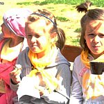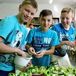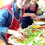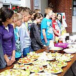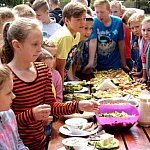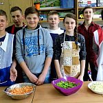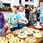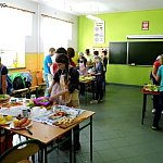 Wczoraj, 13 maja w Szkole Podstawowej w Szewcach Nadolnych obchodzono Dzień Zdrowej Żywności. Został on zaplanowany w ramach realizowanego w szkole programu edukacyjnego „Trzymaj Formę”. Uczniowie klasy piątej i szóstej pod opieką pani Katarzyny Kubiak zaplanowali na ten dzień zdrowe przekąski i napoje. Nie zabrakło masła własnej roboty i maślanki przygotowanych przez panią Iwonę Włodarczyk, a także domowego chleba słonecznikowo-lnianego upieczonego przez panią Dorotę Myszewską (obie panie są mamami uczennic klasy piątej). Uczniowie klasy szóstej zaplanowali samodzielnie i przygotowali pyszne sałatki i surówki , między innymi sałatkę porową, surówkę z jabłek, marchewki i jogurtu, a także sałatkę grecką. Część klasy piątej wraz z pomocą mam, pani Marioli Karpiak, pani Moniki Galant i pani Iwony Włodarczyk, zajęła się przygotowaniem kanapek z nowalijkami i past serowych z dodatkami warzywnymi. Pozostali pod czujnym okiem wychowawczyni przygotowali sok jabłkowy, mus bananowy i jogurt śmietankowo-truskawkowy. Do wspólnej zabawy ze zdrową żywnością obie klasy zaprosiły młodszych kolegów i koleżanki. Na długiej przerwie zaplanowali dla nich degustację tego, co wcześniej przygotowali. Był jednak jeden warunek – „bilet wstępu” za kilka informacji o warzywie lub owocu, a także kolorowy strój.