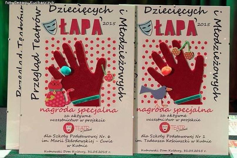 Dziś w Kutnowskim Domu Kultury zakończył się 21 Przegląd Teatrów Dziecięcych i Młodzieżowych „ŁAPA 2015” pod patronatem eKutno.pl. Spektakle przez trzy konkursowe dni oceniało jury dorosłe i dziecięco – młodzieżowe. Oto wyniki pracy jury. W I kategorii WYRÓŻNIENIA INDYWIDUALNE ufundowane przez KDK w postaci nagród rzeczowych dla: 1. Postać BIEDRONKI ze spektaklu „DO BIEDRONKI PRZYSZEDŁ ŻUK” z Przedszkola Miejskiego Nr 16 w Kutnie „Calineczka” - od obu jury 2. Postać ŻUKA ze spektaklu „DO BIEDRONKI PRZYSZEDŁ ŻUK” z Przedszkola Miejskiego Nr 16 w Kutnie „Calineczka” - od obu jury 3. Postać KÓZKI BIAŁOBRZÓSKI ze spektaklu „O KOZACH CO WILKOM UCIEKŁY Z TALERZA” z Przedszkola Miejskiego Nr 15 w Kutnie „Bajka” - od obu jury 4. Postać KÓZKI ZE ZŁAMANĄ NÓŻKĄ ze spektaklu „O KOZACH CO WILKOM UCIEKŁY Z TALERZA” z Przedszkola Miejskiego Nr 15 w Kutnie „Bajka” - od obu jury 5. Postać KOZIOŁKA MATOŁKA ze spektaklu „O KOZACH CO WILKOM UCIEKŁY Z TALERZA” z Przedszkola Miejskiego Nr 15 w Kutnie „Bajka” - od obu jury 6. Postać REŻYSERA ze spektaklu „O KOZACH CO WILKOM UCIEKŁY Z TALERZA” z Przedszkola Miejskiego Nr 15 w Kutnie „Bajka”