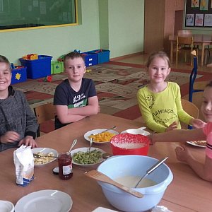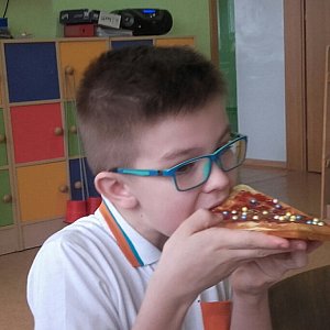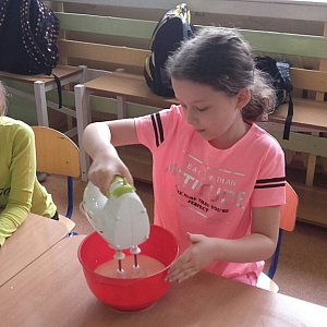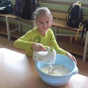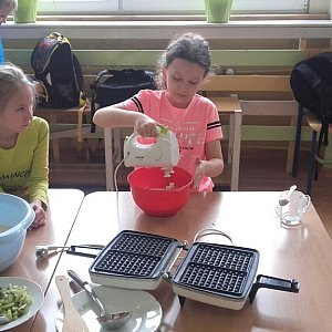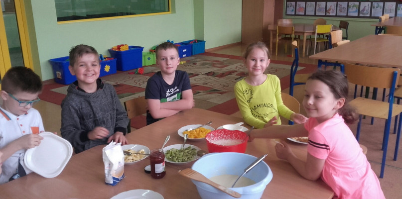 Wyposażeni w odpowiedni sprzęt przystąpiły do przyrządzenia ciasta. Uczniowie odmierzali mąkę, cukier i mleko oraz ubijali ciasto. Wychowawczynie przygotowaną masę wlewały do gofrownicy i wszyscy z niecierpliwością czekali, aż pierwsze gofry się upieką! Gdy gofry były gotowe, wszyscy zabrali się za dekorowanie ich dżemem, cukrem pudrem, śmietaną i świeżymi owocami. Przyjemny zapach roznosił się po korytarzach naszej szkoły i zachęcał do jedzenia. Dzieci były bardzo zadowolone i z niecierpliwością czekają na kolejny raz.