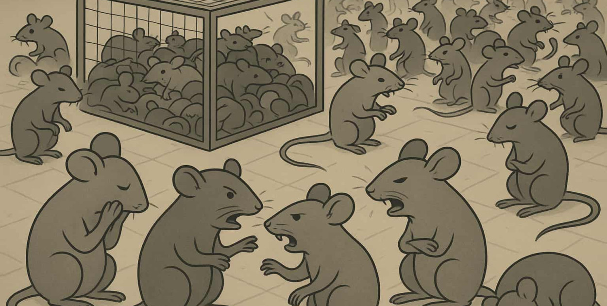 W latach 1968-1972 uczony przeprowadził niezwykle intrygujący eksperyment badający zmiany w populacji kontrolowanej hodowli myszy. W klatce umieszczano cztery mysie pary, które miały zapewnione idealne warunki do rozwoju: nieograniczone pożywienie i wodę, materiały do budowy gniazd, brak zagrożeń ze strony drapieżników, optymalne warunki termiczne oraz opiekę medyczną chroniącą przed chorobami zakaźnymi. Jedynym ograniczeniem była wspomniana klatka. Wydawałoby się, że w tych warunkach należało uzyskać maksymalną populację osobników, która nigdy nie ulegnie zmniejszeniu. Wnioski okazały się całkowicie odmienne.