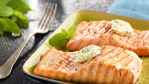 Najpierw przygotowujemy marynatę z łyżki oliwy, łyżeczki słodkiej papryki, łyżeczki pieprzu i połowy łyżeczki musztardy dijon. Następnie smarujemy marynatą dzwonka z łososia i kładziemy je na patelni grillowej.