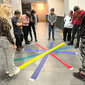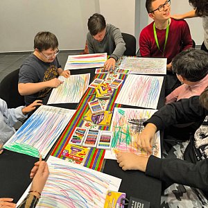 Młodzież i dorośli uczestnicy projektu przygotowywali się tym razem do wyjścia do kawiarni. Uczyli się jak dokonywać wyboru z oferty kawiarnianego menu, trenowali sposoby zamawiania, prostej konwersacji i inne społeczne sytuacje w czasie pobytu w kawiarni. Co ciekawe, najpierw sami wybrali lokal z listy znanych już sobie miejsc w naszym mieście. Wybór padł na otwartą tej jesieni Zieloną Zośkę, miejsce przyjazne sensorycznie, z ograniczoną ilością bodźców, możliwością wyboru muzyki i przystosowania miejsca do podobnych spotkań, co ma ogromne znaczenie dla uczestników zajęć. Druga, jesienna seria zajęć była zgodnie z założeniami projektu muzyczna i artystyczna i miała na celu przygotowanie wszystkich grup do udziału w koncercie sensorycznym. W tracie zajęć uczestnicy między innymi spotkali się z profesjonalnym muzykiem, mieli okazję poznać instrument, próbowali sami improwizować i doświadczyć niezwykłej emisji żywej muzyki. Jedno z takich spotkań było zorganizowane z okazji Święta Niepodległości, było zatem i muzycznie i patriotycznie. W grupie nie brakuje mistrzów instrumentów perkusyjnych, są też miłośnicy wspólnego śpiewania. Muzyka była w trakcie przebiegu całego cyklu zajęć, tłem do różnych ekspresji ruchowych, tanecznych, plastycznych i relaksacyjnych. Dzięki gościnności i współpracy z KDK, jedno ze spotkań udało się zorganizować w Galerii Okno na Sztukę w Kutnowskim Domu Kultury na wystawie „ Mowa linii”. Artystyczne linie prac z wystawy Bogumiła Gardolińskiego były bardzo inspirujące… Warto dodać, że Stowarzyszenie jest częstym gościem tej Galerii i po raz kolejny terapeuci wykorzystali jej otwartą przestrzeń do wspólnej pracy i terapii.