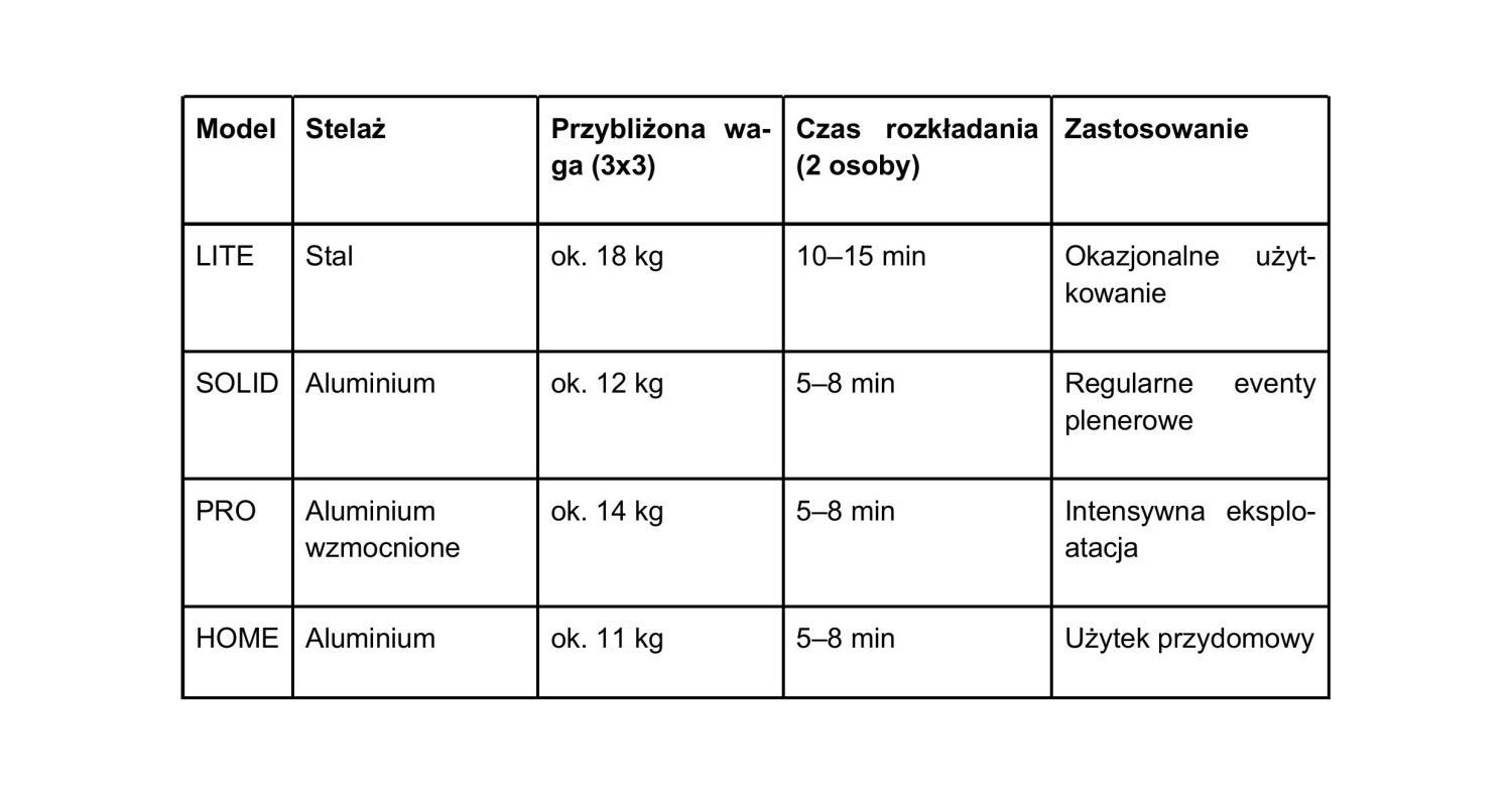 Z tego też względu trzeba podjąć decyzję, czy kupić tańszy model używany kilka razy w roku, czy lepiej zainwestować w sprzęt na wiele sezonów intensywnej pracy. Odpowiedź zależy przede wszystkim od częstotliwości użytkowania i charakteru wydarzeń. Różnice między konstrukcją stalową a aluminiową wpływają nie tylko na trwałość, lecz także na wygodę transportu i montażu.