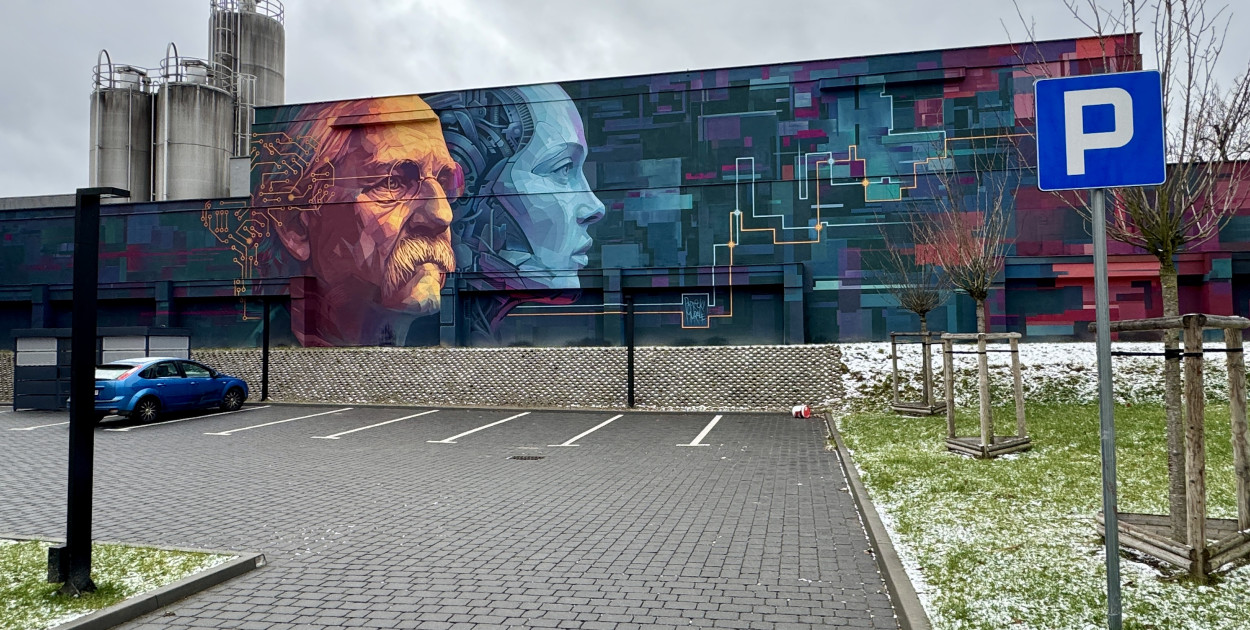 Imponujący mural powstał też na terenie Łódzkiej Specjalnej Strefy Ekonomicznej Przedstawia Ludwika Grohmana i postać wykreowaną przez sztuczną inteligencję. Malowidło zostało stworzone na ścianie fabryki Dakri. Jest ozdobą oddanego niedawno do użytku zielonego terenu ŁSSE od strony ulicy Fabrycznej. Mural namalował krakowski zespół „Paprocki Murale” który tworzą Wiktor Paprocki i Pola Suchodolska. Przypomnijmy, że ŁSSE ma siedzibę w zrewitalizowanej XIX-wiecznej fabryce Grohmana, dlatego fabrykant stał się bohaterem muralu. Postać sztucznej inteligencji ma podkreślać innowacyjność strefy.