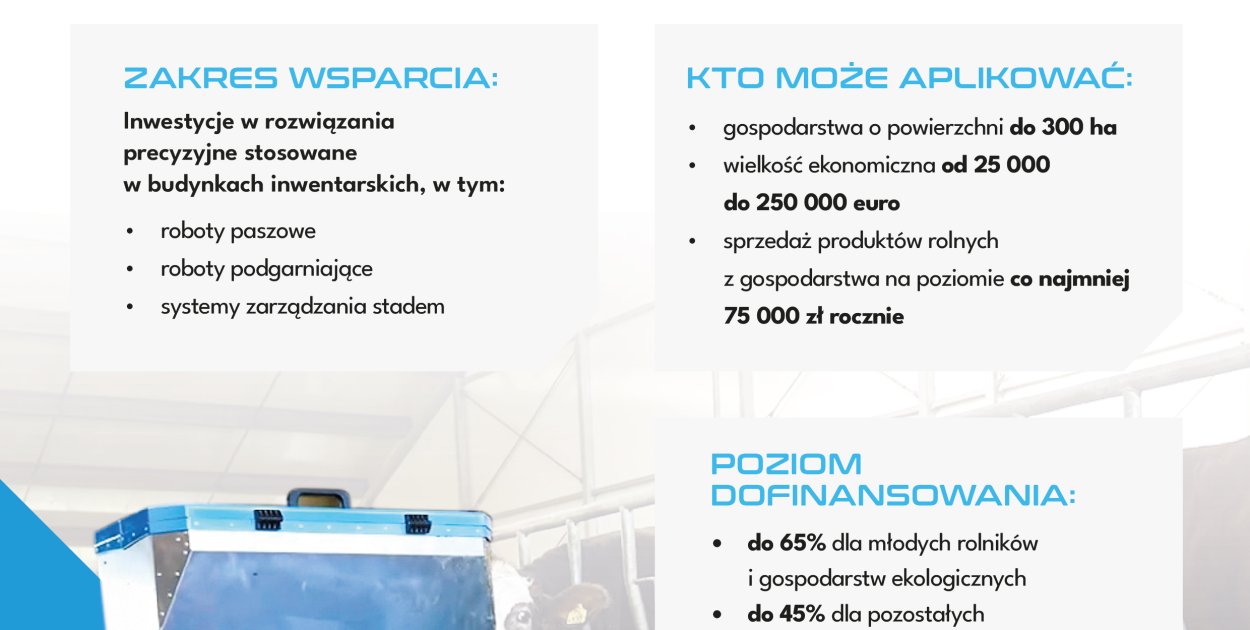 Nabór potrwa do 19 grudnia 2025 roku. To idealny moment, by rolnicy zainteresowani automatyzacją obsługi stada i wdrażaniem rozwiązań rolnictwa precyzyjnego zweryfikowali swoje możliwości i przygotowali wnioski o wsparcie.