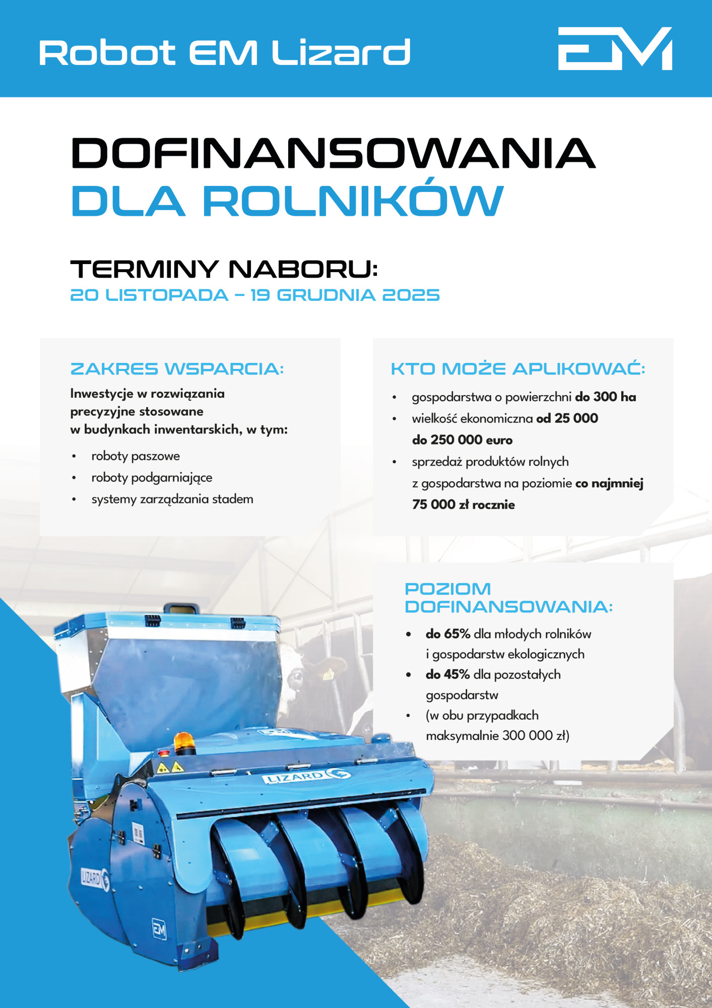 „Zachęcamy rolników, aby wykorzystali ten nabór do wprowadzenia nowoczesnych rozwiązań, które przynoszą wymierne korzyści każdego dnia. Robot EM Lizard to przykład technologii, która realnie usprawnia pracę w gospodarstwie, poprawia efektywność produkcji i pozwala skupić się na tym, co najważniejsze – dobrostanie zwierząt” – dodaje Roszkowski.