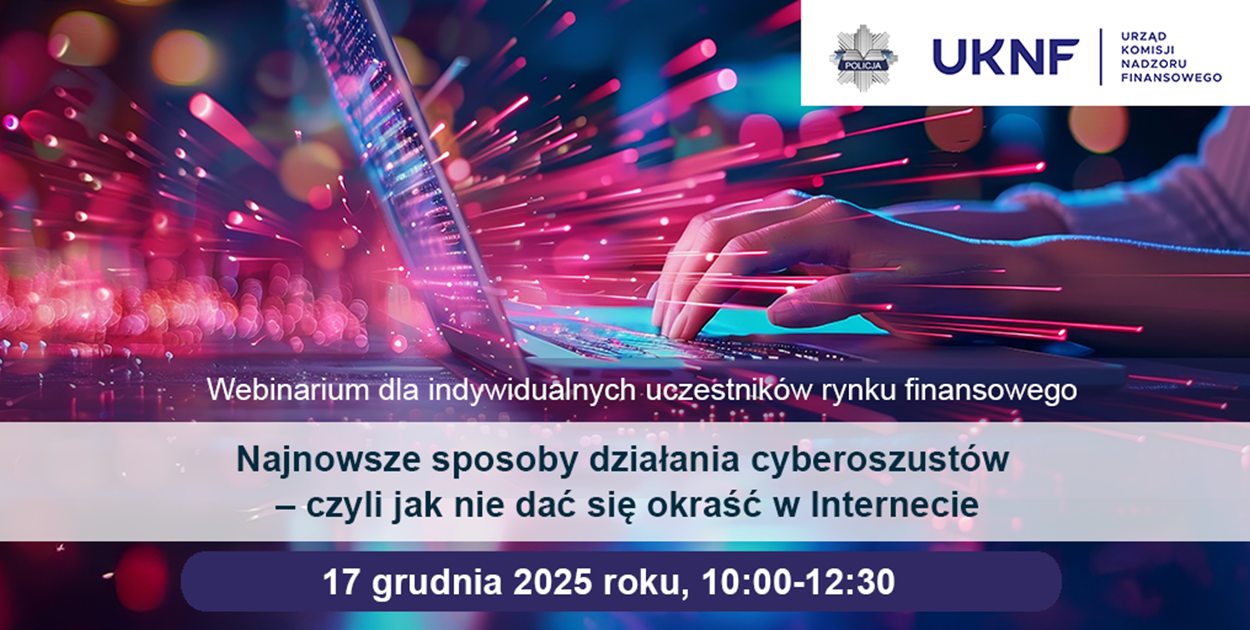 Zapraszamy do udziału w webinarium „Najnowsze sposoby działania cyberoszustów – czyli jak nie dać się okraść w Internecie", które odbędzie się 17 grudnia 2025 roku (10:00-12:30).