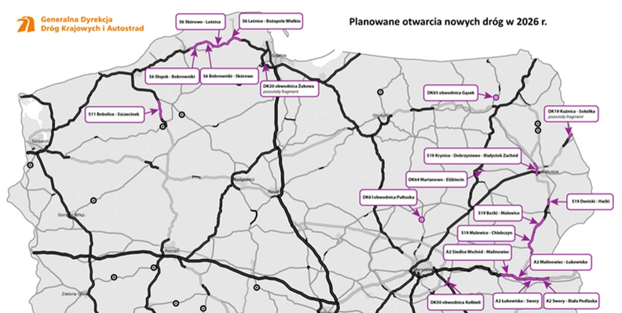 Połączenie drogą ekspresową Szczecina z Gdańskiem, domknięcie IV obwodnicy Krakowa, a także finalizacja kolejnych fragmentów międzynarodowego szlaku Via Carpatia - przyszły rok zapowiada się nie mniej ciekawie, niż ten mijający. Dzięki oddaniu nowych odcinków już w I kwartale 2026 r. przekroczymy granicę 5,5 tys. km tras szybkiego ruchu w Polsce.