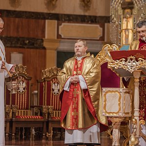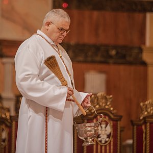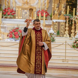 Msza rozpoczęła się obrzędem aspersji – pokropienia wiernych wodą święconą, która ma przypominać o łasce chrztu oraz pragnieniu odnowienia w nas Bożej obecności. Ksiądz kustosz Sławomir Homoncik MIC przypomniał, że gest znaku krzyża, czyniony przy wejściu do świątyni – jest świadectwem naszej przynależności do wspólnoty Kościoła i dziecięctwa Bożego. „Niech obrzęd ten przypomni nam, że przez chrzest zostaliśmy zanurzeni w miłości Chrystusa i naznaczeni pieczęcią Ducha Świętego” – mówił kapłan.