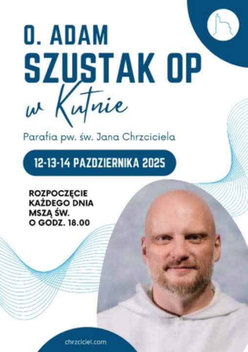 12, 13 i 14 października Parafia pw. św. Jana Chrzciciela w Kutnie gościć będzie o. Adama Szustaka. Zapraszamy każdego dnia na mszę św. o godz. 18.00. Adam Szustak to polski duchowny rzymskokatolicki, prezbiter, dominikanin, wędrowny kaznodzieja, duszpasterz akademicki, vloger, autor książek i audiobooków.