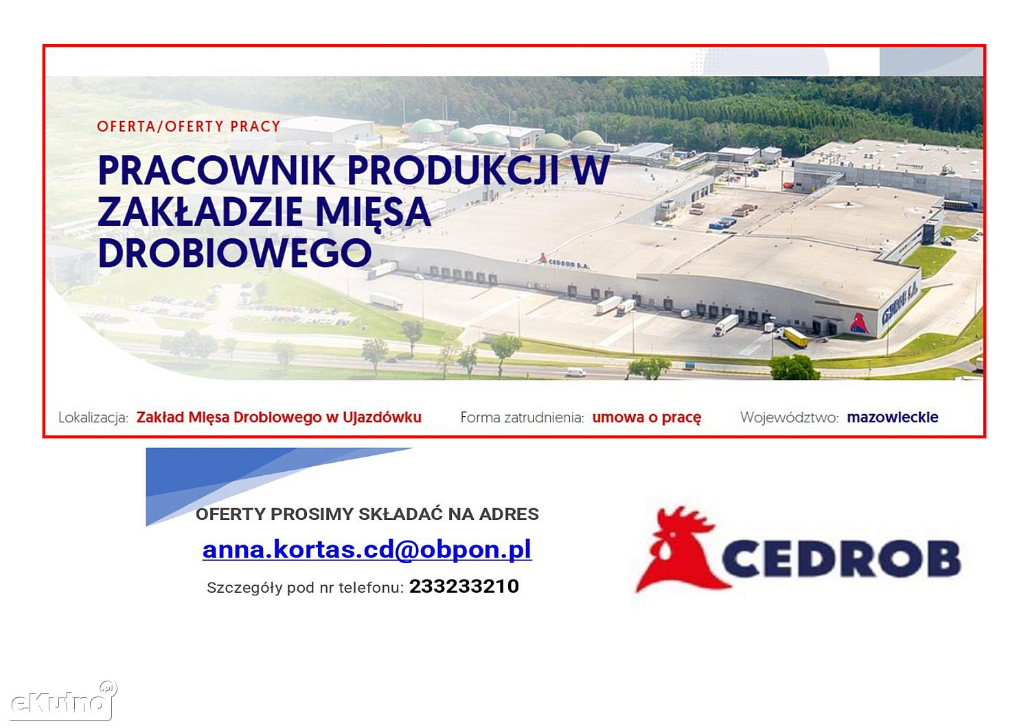 „Wyrażam zgodę na przetwarzanie moich danych osobowych przez CEDROB S.A. z siedzibą w Ujazdówku Ujazdówek 2a, 06-400 Ciechanów, w celu prowadzenia rekrutacji na aplikowane przeze mnie stanowisko”.
